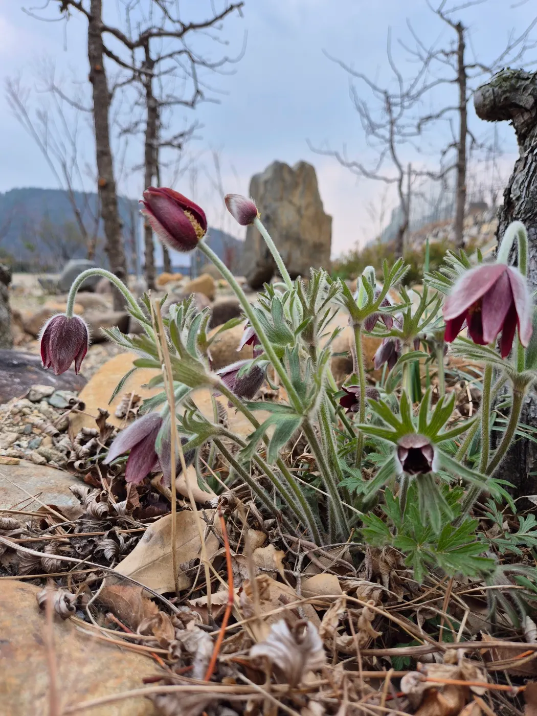 소나무 아래 수줍은 듯 피어난 할미꽃